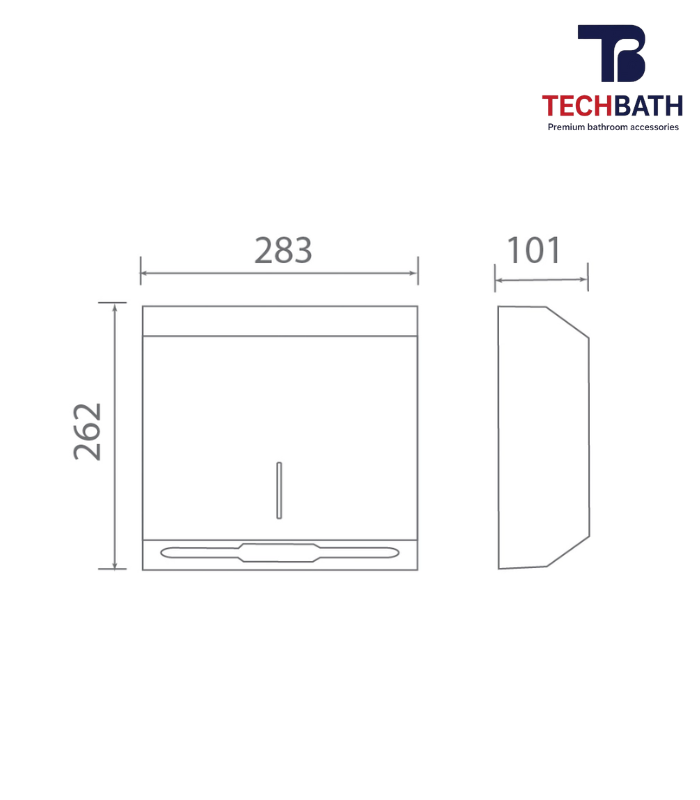 Kích thước tổng thể hộp lần lượt dài, rộng, cao của hộp đựng giấy vệ sinh inox TECHBATH T1705.02 là: 283x101x262mm.