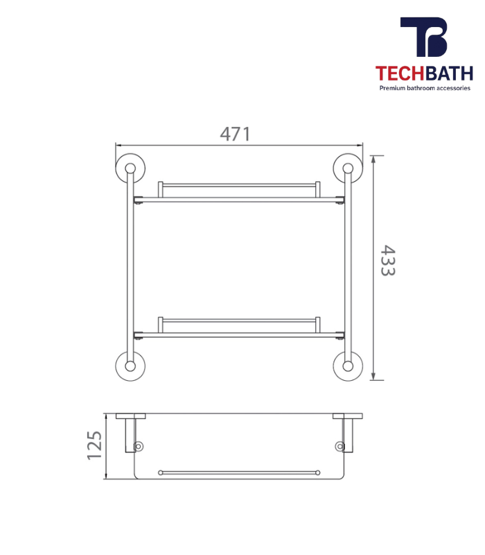 Kệ kính nhà tắm TECHBATH T1214.01 có thiết kế nhỏ gọn, diện tích 471x125x433mm dễ dàng lắp đặt tại nhiều vị trí khác nhau.