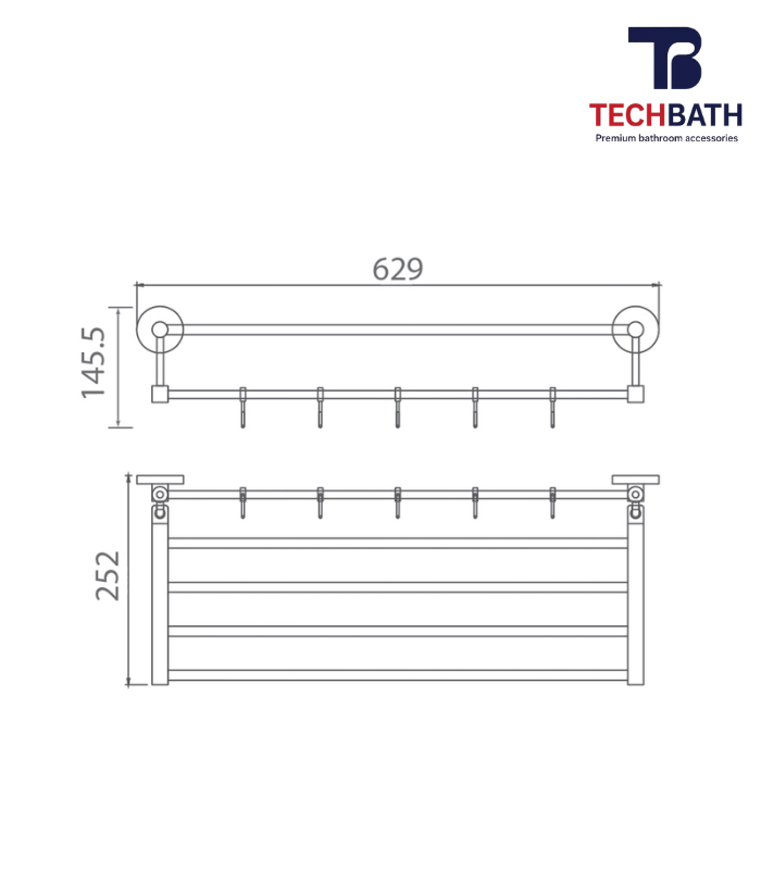 Giàn vắt khăn tắm inox TECHBATH T1209.13 có kết cấu gồm móc treo và giàn để đồ giúp gia tăng số lượng đồ được treo, đồng thời đảm bảo phục vụ nhu cầu sử dụng của nhiều gia đình.