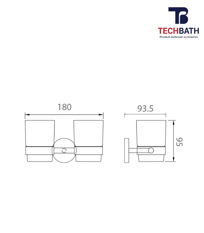 Giá cốc đôi TECHBATH T1210.04 với kích thước nhỏ gọn 180×93.5x95mm, phụ kiện cơ bản được cấu tạo gồm 3 bộ phận chính: đế và giá inox, cốc thủy tinh.